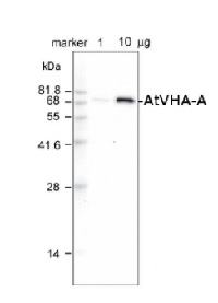 1 µg and 10 µg of crude membrane fraction/lane from Arabidopsis thaliana were separated on 12 % SDS-PAGE and blotted 1h to PVDF membrane (40 min. at 10 V using BioRad semidry transfer). Filters were blocked 1h with 5 % low-fat milk powder in TBS-T (0.05% Triton X.100). Membranes were washed 5 times with TBS-T, each time in a fresh polystyrene box and probed with anti-V-ATPase subunit A antibodies (AS09 467, 1:2000, 1h) and secondary anti-rabbit (1:2000, 1 h). All steps were performed in RT with agitation.