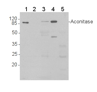 Western blot analysis of 1) 5 ng purified 6xHis-AtACO1 (Δ119, 87 kDa); 2) 2 ng 6xHis-AtACO1; 3) Total protein (15 μg) from Arabidopsis thaliana leaves were extracted with 2 volumes 50 mM Tris-HCl pH 8.0, 5% (v/v) glycerol, 1% (w/v) sodium dodecyl sulphate, 10 mM NaEDTA, 1 mM phenylmethanesulfonyl fluoride; 4) 15 µg of purified mitochondria from Arabidopsis thaliana cell culture, 5) 15 µg of protein from Arabidopsis thaliana chloroplasts
