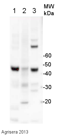 15 µg of total protein extracted with PEB (AS08 300) from leaf tissue of (1) Arabidopsis thaliana, (2) Hordeum vulgare, (3) Zea mays were separated on 4-12% NuPage (Invitrogen) LDS-PAGE and blotted 1h to PVDF. Filters were blocked 1h with 2% low-fat milk powder in TBS-T (0.1% TWEEN 20) and probed with anti-actin (AS13 2640, 1:2500, 1h) and secondary anti-rabbit (1:10 000, 1 h) antibody (HRP conjugated, recommended secondary antibody AS09 602) in TBS-T containing 2% low fat milk powder. Antibody incubations were followed by washings in TBS-T (15, +5, +5, +5 min). All steps were performed at RT with agitation. Signal was detected with chemiluminescent detection reagent using a Fuji LAS-3000 CCD (300s, standard sensitivity). Exposure time was 2 min.