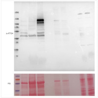 20 ug/well of total protein freshly extracted from leafy tissue of Physcomitrium patens of the wild-type and atg4a/b knockout backgrounds (recently established in my group, not published). Plant material was flash frozen in liquid N2, powdered and mixed 1:1 with 2xLaemmli buffer. Samples were boiled at 90C for 5 minutes, spund down at 17000g for 5 minutes-> supernatants were stored at -20C at preheated at 95C for 1 minute before loading on the gel Samples were separated in the cold on precast TGX, StainFree Bio-Rad 4-20% SDS-PAGE and blotted for 7.5 minutes to PVDF using Bio-Rad premade cassettes and Turbo program for semi-dry transfer. Blot was blocked with 5% milk for 15 minutes at RT with agitation. Blot was incubated in the primary antibody at a dilution of 1:500 for 48h at 4°C. The antibody solution was decanted, and the blot was washed four times for 10 minutes in PBS-T at RT with agitation. Blot was incubated in a-rabbit HRP secondary antibody (AS09 602-trial Goat anti-rabbit HRP conjugated) diluted to 1: 50 000 in 2.5% skim milk for 1 h/RT with agitation. The blot was washed as above and developed with a following chemiluminescent detection reagent: ECL, Bio-Rad. Exposure time was collected in accumulation mode, every second for the period of 100 seconds. After luminescence detection, the membrane was stained with Ponceau S for loading control.Note: Shorter incubation time with ATG4 antibody will decrease background singal.