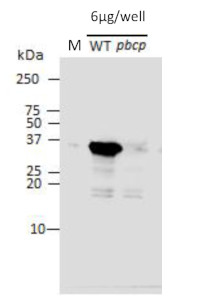 Total protein was extracted from Arabidopsis thaliana wild-type (WT, Col-0) and Atpbcp (AT2G3017) mutant lines using I.P. buffer.