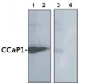 5 µg (1,3) and 2.5 µg (2,5) of lysate from E.coli cells expressing CCaP1 protein/lane were separated on 12 % SDS-PAGE and blotted 1h to PVDF membrane (40 min. at 10 V using BioRad semidry transfer). Filters were blocked 1h with 5 % low-fat milk powder in TBS-T (0.05% Triton X.100). Membranes were washed 5 times with TBS-T, each time in a fresh polystyrene box and probed with anti-CCaP1 antibodies (AS09 483, 1:1000, 1h) and secondary anti-rabbit (1:2000, 1 h). All steps were performed in RT with agitation.