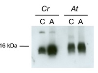 15 µg of total protein from Chlamydomonas reinhardtii and Arabidopsis thaliana were separated on 15 % SDS-PAGE and blotted 1h to nitrocellulose membrane using semi-dry transfer. Blots were blocked with 5 % dry milk in PBS for 1h at room temperature (RT) with agitation. Blot was incubated in the primary antibody at a dilution of 1:1 000 over night at 4 ºC with agitation. The antibody solution was decanted and the blot was rinsed briefly twice, then washed once for 15 min and 3 times for 5 min in TBS-T at RT with agitation. Blot was incubated in secondary antibody (anti-rabbit IgG horse radish peroxidase conjugated, AS09 602 from Agrisera) diluted to 1:10 000 in 5 % dry milk for 1h at RT with agitation. The blot was washed as above and developed for 5 min with chemiluminescent detection reagent, according to the manufacturer's instructions. Exposure time was 60 seconds.Courtesy of Dr. María Esther Pérez-Pérez and Ana M. Laureano-Marín, IBVF, SpainApplication examples: