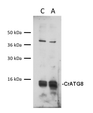 30 µg of total protein from Chlamydomonas reinhardtii , control (C), autophagy induced (A), extracted with lysis buffer according to Perez-Perez et al. 2010 (Plant Physiology 152: 1874-1888) were separated on 15 % SDS-PAGE and blotted 1h to nitrocellulose membrane using semi-dry or tank transfer. Blots were blocked with 5% milk for 1h at room temperature (RT) with agitation. Blot was incubated in the primary antibody at a dilution of 1:1000 for 1h at RT with agitation. The antibody solution was decanted and the blot was rinsed briefly twice, then washed once for 15 min and 3 times for 5 min in TBS-T at RT with agitation. Blot was incubated in secondary antibody (anti-rabbit IgG horse radish peroxidase conjugated, from Agrisera AS09 602, diluted to 1:25 000) for 1h at RT with agitation. The blot was washed as above and developed for 5 min with chemiluminescent detection reagent, according to the manufacturer's instructions. Exposure time was 45 seconds.Courtesy of Dr. María Esther Pérez-Perez, IBVF, Spain