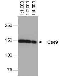 Protein extracts from HEK293 cells were transfected with a myc-tagged Cas9. Visualization was made using monoclonal anti-Cas) antibodies used in annotated dilutions.