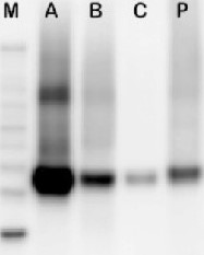 5 µg of total protein from Arabidopsis thaliana (A), Hordeum vulgare (B), Zea mays (C), Physcomitrella patens (P) extracted with Agrisera PEB buffer were separated on 4-12 % SDS-PAGE and blotted 70 min to PVDF. Blots were blocked with ECL Advance Blocking Reagent (GE Healthcare) for 1h at room temperature (RT) with agitation. Blot was incubated for 1 h with either rabbit pre-serum (1: 10 000), rabbit anti-eEF1alpha antibody (1: 10 000) and anti-eEF1 alpha serum incubated with eEF1alpha synthetic peptide (in 100 mM excess to saturate a signal from specific antibody) for 1h at RT with agitation. The antibody solution was decanted and the blot was rinsed briefly twice, then washed once for 15 min and 3 times for 5 min in TBS-T at RT with agitation. Blot was incubated in secondary antibody (anti-rabbit IgG horse radish peroxidase conjugated, AS09 602, Agrisera ) diluted to 1:50 000 in for 1h at RT with agitation. The blot was washed as above and developed for 5 min with ECL according to the manufacturers instructions. Exposure time was 2 minutes.