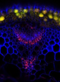 Localization of fucosylated xyloglucan (red) in Arabidopsis thaliana hypocotyl, Calcufluor White counterstain (blue) and cell wall autofluorescence (yellow).