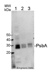 5 µg of total extract from (1) Hordeum vulgare total leaf, (2) Zea mays (3) Spinacia oleracea extracted with PEB (AS08 300) were separated on 4-12% NuPage (Invitrogen) LDS-PAGE and blotted 1h to PVDF. Blots were blocked immediately following transfer in 2% ECL Advance blocking reagent (GE Healthcare) in 20 mM Tris, 137 mM sodium chloride pH 7.6 with 0.1% (v/v) Tween-20 (TBS-T) for 1h at room temperature with agitation. Blots were incubated in the primary anti-PsbA antibody (AS01 016) at a dilution of 1: 10 000 for 1h at room temperature with agitation. The antibody solution was decanted and the blot was rinsed briefly twice, then washed once for 15 min and 3 times for 5 min in TBS-T at room temperature with agitation. Blots were incubated in secondary antibody (anti-hen IgG horse radish peroxidase conjugated, AGRISERA) diluted to 1:50 000 in 2% ECL Advance blocking solution for 1h at room temperature with agitation. The blots were washed as above and developed for 5 min with chemiluminescen detection reagent according to the manufacturers instructions. Images of the blots were obtained using a CCD imager (FluorSMax, Bio-Rad) and Quantity One software (Bio-Rad). Exposure time was 30 seconds.