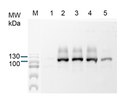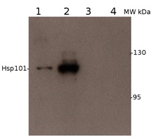 2 µg of total protein from (1) Arabidopsis thaliana WT stressed at 22ºC, (2) Arabidopsis thaliana WT stressed at 38ºC for 1.5 hour followed by a transfer to 22° for 2 hours, (3) Arabidopsis thaliana Hsp101 null mutnat grown at 22°C, (4) Arabidopsis thaliana Hsp101 null mutant stressed at 38ºC for 1.5 hour followed by a transfer to 22ºC for 2 hours were separated on 8 % SDS-PAGE and blotted 1h to nitrocellulose (Biorad). Blots were incubated in the primary antibody at a dilution of 1: 1 000 for 1h at room temperature with agitation and a secondary HRP-conjugated antibody (1: 10 000).