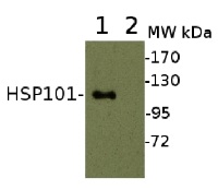 2 µg of total protein from (1) Arabidopsis thaliana WT stressed at 38ºC for 1.5 hour, (2) Arabidopsis thaliana HSP101 null mutant (hot 1-3) were separated on 7.5% SDS-PAGE and blotted 1h to nitrocellulose (Biorad). Blots were incubated in the primary antibody at a dilution of 1: 1 000 for 1h at room temperature with agitation and secondary HRP-conjugated antibody (1: 10 000).