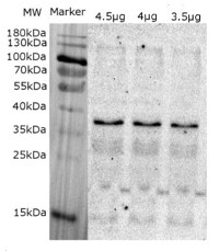 Host: Rabbit Clonality: Polyclonal Purity: Serum Format: Lyophilized Quantity: 200 µl Reconstitution: For reconstitution add 200 µl of sterile water Storage: Store lyophilized/reconstituted at -20°C; once reconstituted make aliquots to avoid repeated freeze-thaw cycles. Please remember to spin the tubes briefly prior to opening them to avoid any losses that might occur from material adhering to the cap or sides of the tube. Tested applications: Western blot (WB) Recommended dilution: 1 : 2000 (WB) Expected | apparent MW: 33 kDa