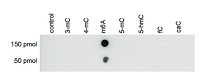 Dot blot: using anti-m6A rabbit polyclonal antibody with synthetic peptides containing different mofified bases in a range from 50 to 150 pmol) which were spotted on a membrane (Amersham Hybond-N+). The membrane was incubated with the mouse anti-m6A polyclonal antibody (dilution 1:400) in TBS-T with a 1 % non-fat-dry milk. - Additional Information