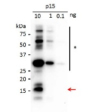 Immunogen: Recombinant p15 [Peanut clump virus] Protein accession number: NP_620041. Host: Rabbit Clonality: Polyclonal Purity: Serum Format: Lyophilized Quantity: 50 µl Reconstitution: For reconstitution add 50 µl of sterile water Storage: Store lyophilized/reconstituted at -20°C; once reconstituted make aliquots to avoid repeated freeze-thaw cycles. Please remember to spin the tubes briefly prior to opening them to avoid any losses that might occur from material adhering to the cap or sides of the tube. Tested applications: Western blot (WB) Recommended dilution: 1 : 5000 (WB) Expected | apparent MW: 14.6 | 15 kDa - Reactivity