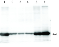 2 µg of total protein from (1-7) Prochlorococcus sp. extracted with Protein Extration Buffer, PEB (AS08 300), (8-11) Rubisco protein standard (AS01 017S) were separated on 4-12% NuPage (Invitrogen) LDS-PAGE and blotted 1h to PVDF. Blots were blocked immediately following transfer for 1h/RT with agitation. Blots were incubated in the primary antibody at a dilution of 1: 20 000 for 1h at room temperature with agitation. The antibody solution was decanted and the blot was rinsed briefly twice, then washed once for 15 min and 3 times for 5 min in TBS-T at room temperature with agitation. Blots were incubated in secondary antibody (anti-rabbit IgG horse radish peroxidase conjugated) diluted to 1:50 000 for 1h/RT with agitation. The blots were washed as above and developed for 5 min with ECL detection reagent according the manufacturers instructions. Images of the blots were obtained using a CCD imager (FluorSMax, Bio-Rad) and Quantity One software (Bio-Rad). There is a low level of a known RbcL cleavage product below the main band in som eof the Prochlorococcus samples.