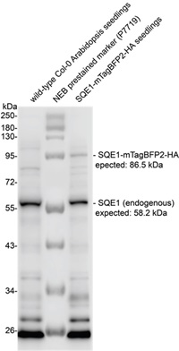 60 µL of tissue extracted freshly from Arabidopsis thaliana seedlings was ground with a pestle and three volumes of sample buffer [(500 mM Tris pH 8.0, 4% (w/v) lithium dodecyl sulfate, 1 mM EDTA, 20% (w/v) glycerol, 11 μM Coomassie blue G250, 16.6 μM phenol red, 50 μM dithiothreitol (DTT)] was added. Proteins were denatured by boiling the samples at 100°C for 5 min. Samples were separated at room temperature on 10% SDS-PAGE (Bolt Bis-Tris gels) and transferred (wet) for 15 minutes to nitrocellulose (pore size 0.45 μm), using an eBlot L1 transfer system (GenScript). Blot was blocked with 5% BSA for 1 h at room temp with rocking. Blot was incubated in the primary antibody at a dilution of 1:500 overnight at 4°C with rocking. The antibody solution was decanted, and the blot was rinsed briefly, then washed 3 times for 5 min in TBS-T at room temp with rocking. Blot was incubated in matching secondary antibody (anti-rabbit IgG horse radish peroxidase conjugated) diluted to 1:2 500 in 5% BSA for 1 hour at room temp with rocking. The blot was washed as above and developed with WesternSure Premium Chemiluminescent substrate (Thermo Fisher, 50-489-552) for 3 minutes. Exposure time was 3 minutes.