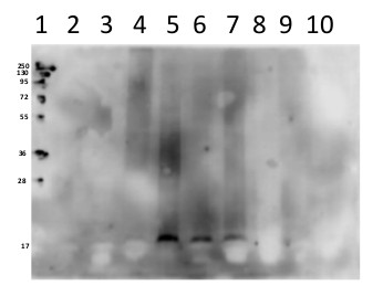 Following samples were analyzed: MW markers (1), Arabidopsis thaliana tonoplast (2), Arabidopsis thaliana plasma membrane (3), Arabidopsis thaliana microsomes (4), Arabidopsis thaliana total protein (5), Mesembryanthemum crystallinum tonoplast (6), Mesembryanthemum crystallinum plasma membrane (7), Mesembryanthemum crystallinum microsomes (8), Nicotiana tabacum microsomes (9), Brassica napus microsomes (10). 15 µg of the indicated protein, extracted according to Vera-Estrella et al. (2012) was separated on 12% SDS-PAGE and blotted 1.15h to PVDF using tank transfer. Blots were blocked with for 1h at room temperature (RT) with agitation. Blot was incubated in the primary antibody at a dilution of 1: 1 000 O/N at RT with agitation. The antibody solution was decanted and the blot was washed 3X for 15 min min in TBS-T at RT with agitation. Blot was incubated in secondary antibody (anti-rabbit IgG horse radish peroxidase conjugated, from Agrisera AS09 602 ) diluted to 1:50 000 in for 2h at RT with agitation. The blot was washed as above and developed using chemiluminescent substrated and recorder using the LiCOR c-DIGIT personal imager.Courtesy Dr. Bronwyn Barkla. UNAM, Mexico - Additional Information
